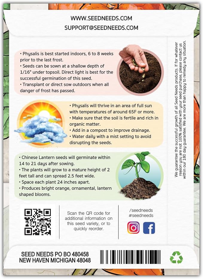 Seed Needs, Chinese Lantern Seeds for Planting (Physalis Alkekengi) Heirloom & Open Pollinated - Orange Ornamental Pods (2 Packs)