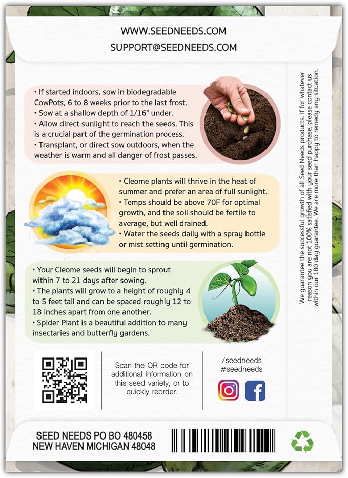- Freshness - All Cleome seeds are packaged in tear resistant and moisture resistant packaging. This keeps the seeds a whole lot fresher than the competitions selection!