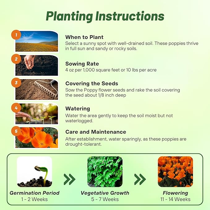- VIBRANT & ADAPTABLE BLOOMS: Our California poppy seeds for planting produce stunning bright orange flowers with delicate petals that thrive in USDA zones 3-9. The adaptable nature of our poppies makes them ideal for various soil types and climates, perfect for wildflower gardens, meadow plantings, and natural landscapes. Their vivid color adds visual appeal to any garden or flower bed.