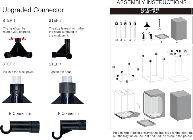 - Upgrade Design --- UPGRADED CONNECTOR--Durable PA Material Adopted, Anti-rust Reinforced Design, Adjustable Tightness According to The Pole, Hold Poles Tightly for Firmed Support. Multiple vents to accommodate fans and filter; ducting rectangle window with mesh to keep dust and insects out; Removable mylar floor tray easy to clean.