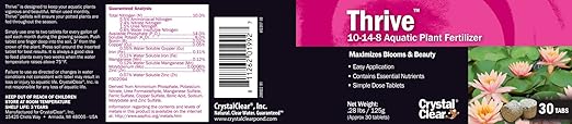 - Maximum Blooms & Beauty -- Thrive contains nutrients to keep aquatic plants growing vigorous leaves and beautiful blooms. Water gardening just got easier with fertilizer tabs for container plants.
