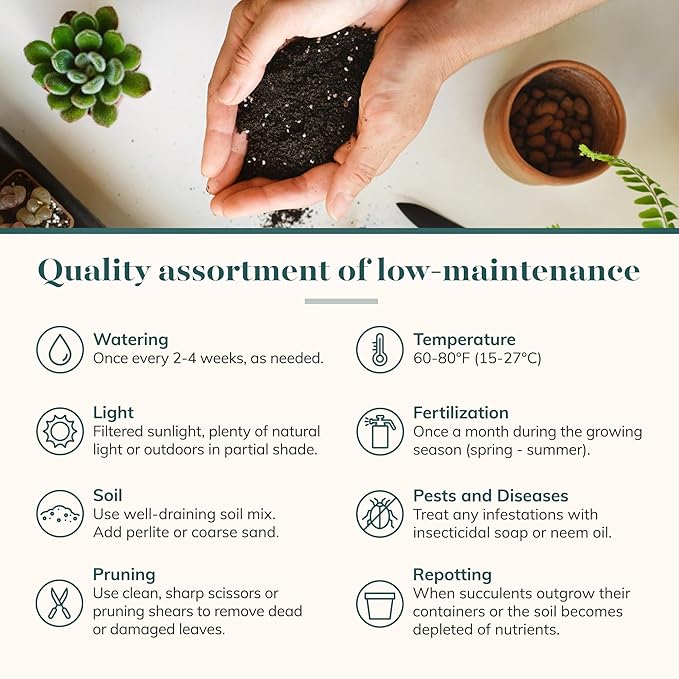 - What to Expect: While the assorted collection includes some repeat species, we've designed it to offer a diverse range of succulent species. This collection provides both familiarity and excitement, making sure you have a well-rounded succulent garden that's full of beauty. As the industry leader in online plants, we offer a quality guarantee covering the health of our plants 100% upon delivery, providing you the ultimate peace of mind while buying plants online.
