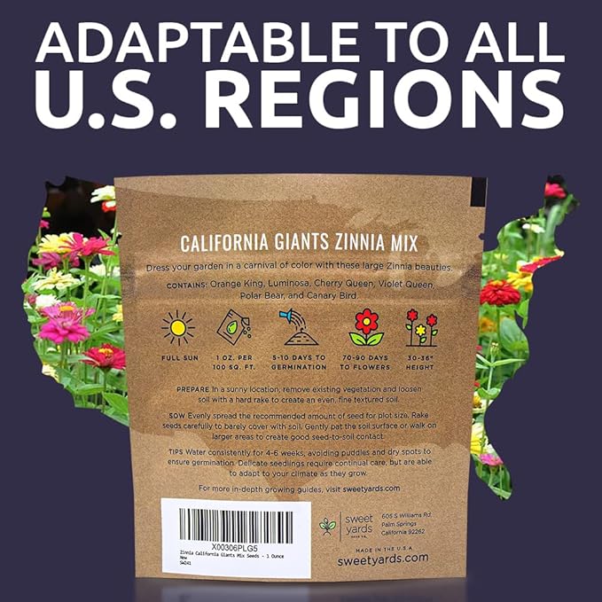 Zinnia Seeds - California Giants Mix - Large 1 Ounce Packet - 3,000 Flower Seeds - Mixed Colors and Large Blooms