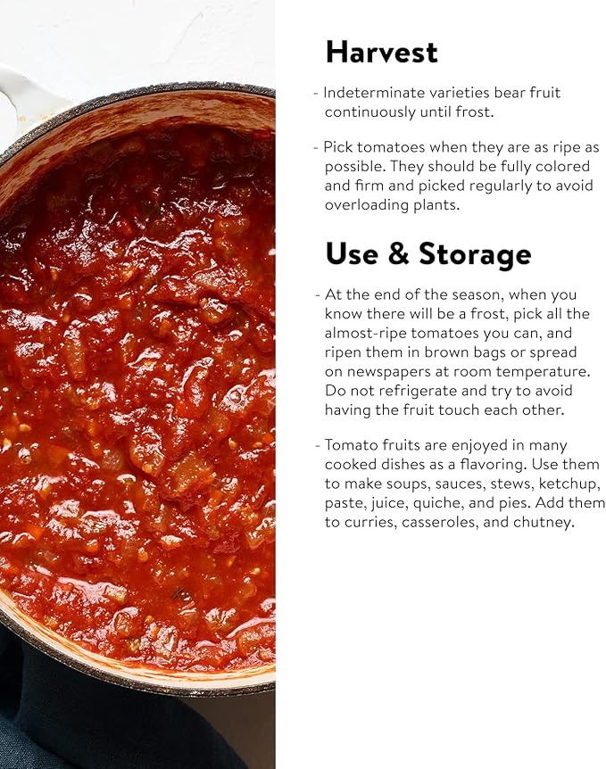 - EASY GROW SEEDS: Healthy, indeterminate tomato vines produce all summer long, beginning about 72 days after transplanting into the outdoor garden. Bred to thrive, these seeds produce healthy 50" tall plants with a 60" spread and a 8oz fruit harvest.