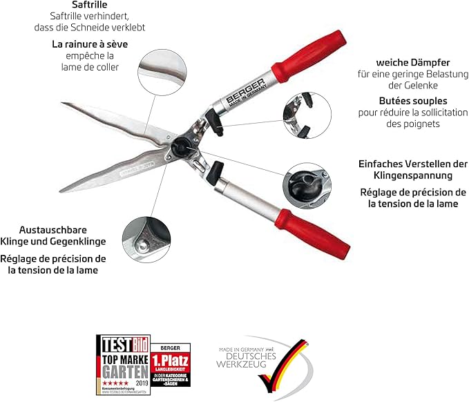 - No slipping: The special serrated blades ensure the best possible grip of branches to be cut, the two sap grooves are self-cleaning and enable a particularly efficient, stick-free cutting - each cut is clean and precise for a healthy growth of your hedges and shrubs