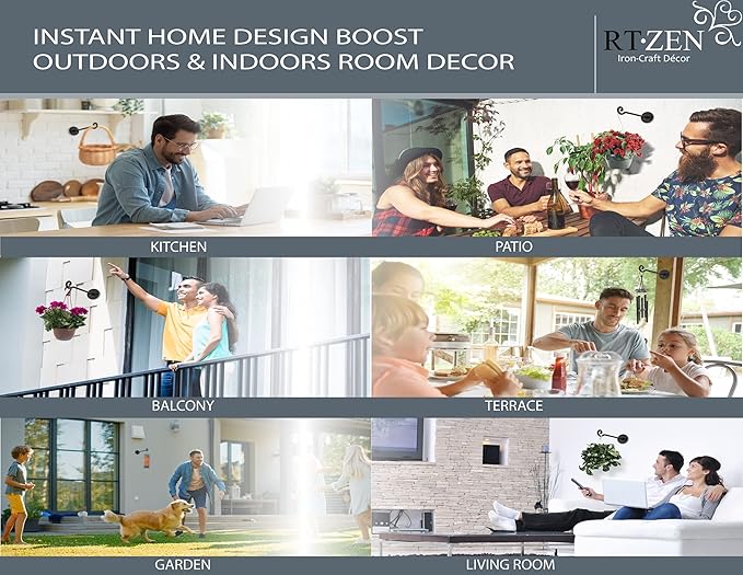 RTZEN Plant Hangers Outdoor or Indoor - Wrought Iron Metal Hanger Indoor Hook - Heavy Duty Wall Bracket Hooks for Hanging Plants Baskets Lanterns Wind Chimes - 2 Pack (Black Swirl Hooks)