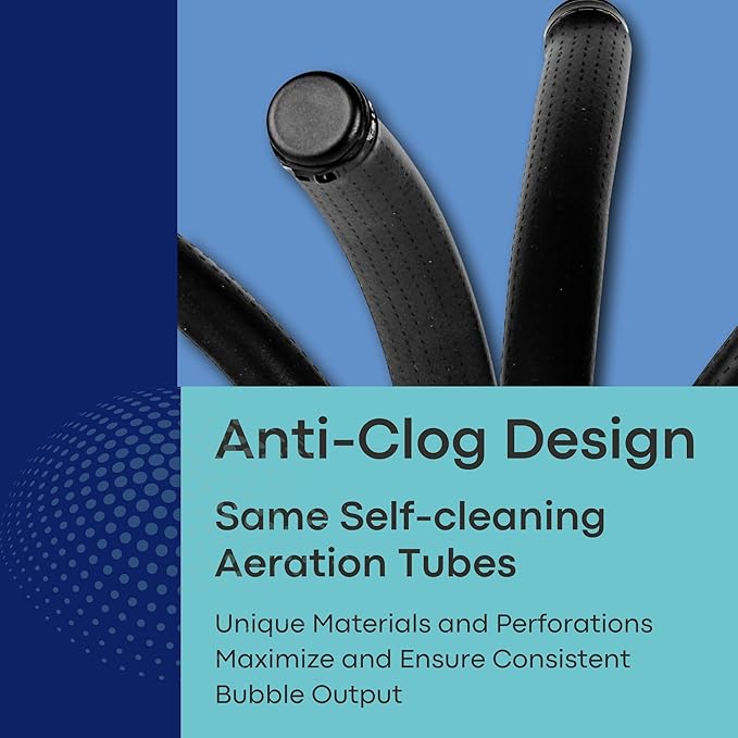 - Anti-Clog Design – Unique materials and self-cleaning perforations maximize output and ensure consistent bubbles for years of trouble free oxygenation.