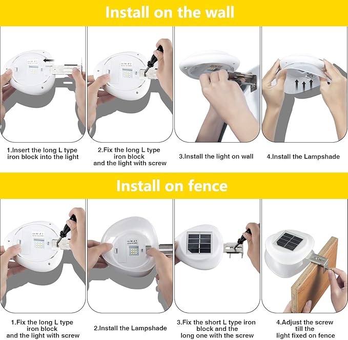 - 9 Led Outdoor Solar Lights: 9 LED fence lights with larger solar panels and batteries, Last about 6-10 hours. The charging effect depends on the temperature and the time of direct sunlight, please install the solar lights in the place where can get sunlight directly