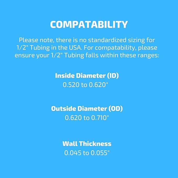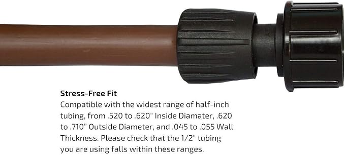 - Stress-Free Fit: Our irrigation faucet adapter connection works with the widest range of half inch tubing, from .520 to .620" Inside Diamater, .620 to .710” Outside Diameter and .045 to .055 Wall Thickness. Important: Please make sure your tubing specifications fall within these ranges for the proper fit. Compatible with many models of Rainbird, Orbit, Dig, Hunter and Toro tubing as well as generic 1/2" blank drip irrigation tube or drip line. Large fitting ID means less flow restriction.