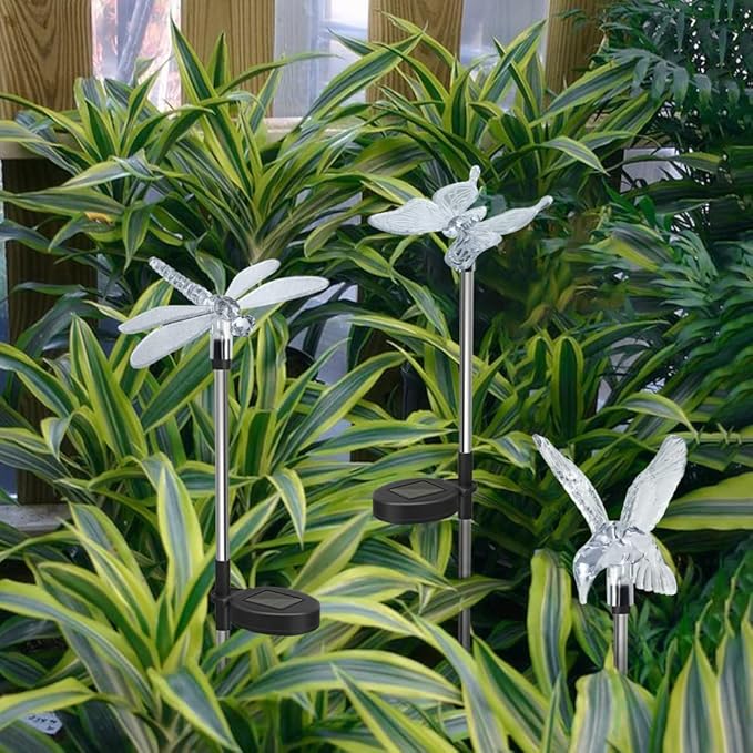- Solar Insect Lights Outdoor: This garden stake light set includes 2 butterflies, 2 hummingbirds and 2 dragonflies, each light has 1 high brightness light bead and light transmitting crystals that change the color of the lighting at night