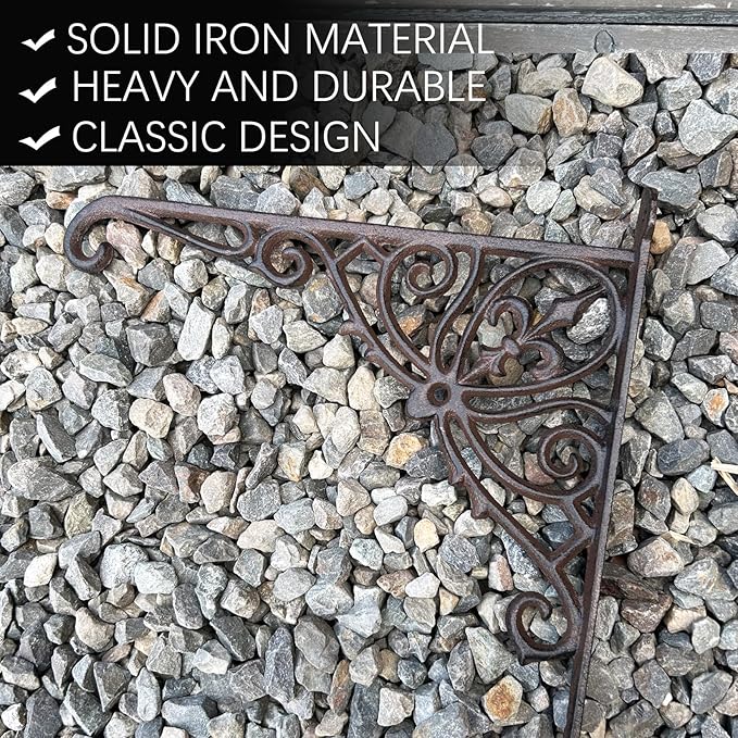 - HEAVY AND CAST IRON MATERIAL: Heavy duty and quality guarantee decorative and functional for hanging flower baskets, pots etc.multi function bracket in brown color rusty looking. Outdoor or indoor usage. Installation screws are included