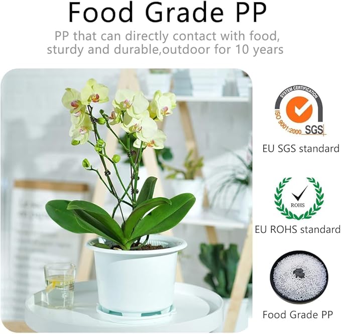 - Made of Plastic that Come Into Direct Contact with Food,Sturdy and Used in Outdoor for 10 Years: This 8 inch large orchid pot is made of food grade plastic that can be used in direct contact with food,sturdy and last for 10 years in outdoor.