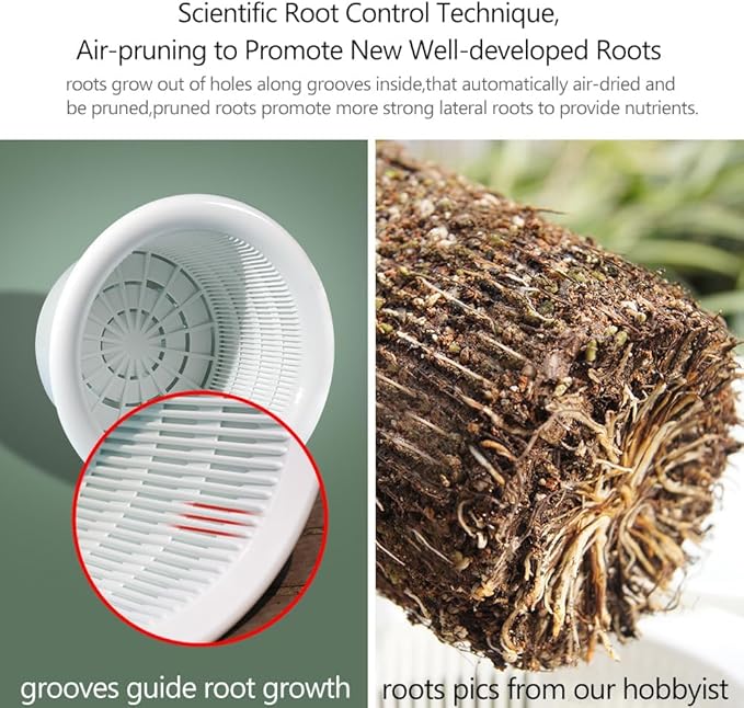 - 8 Inch Orchid Pot Owns Scientic Controlling Roots Technology,Develop Strong Lateral Roots: When roots grow to inwall of the orchid pot,roots are guided by the grooves and grow downwards to the ventilation holes around the orchid pot,roots exposed to air through the holes will dry and be pruned,and the pruned roots develop a large number of strong lateral roots inside the orchid pot,so as to achieve the effect of controlling roots and strengthening roots to provide more nutrients for orchids.