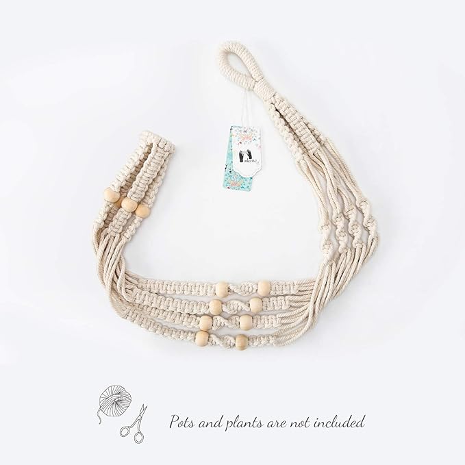 Mkono Macrame Plant Hanger Indoor Hanging Planter Basket with Wood Beads Decorative Flower Pot Holder No Tassels for Indoor Outdoor Boho Home Decor 35 Inch, Ivory, Set of 1 (POTS NOT Included)