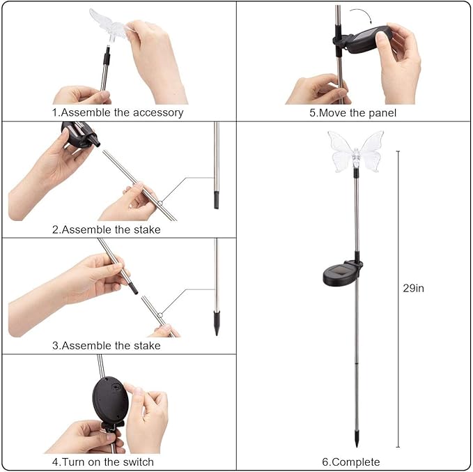 - 【Automatically Lights Up】 Butterfly garden stake lights automatically light up in the dark to illuminate your garden and pathway. Fully charged solar lights can work 6-8 hours at night