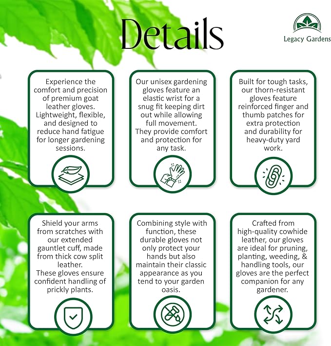 - BREATHABLE LEATHER FOR SOFTER HANDS - The A-grade goatskin leather these thorn proof garden gloves are made of was chosen specifically for its skin-sensitive properties. While lesser quality competing items use materials that cause sweating, discomfort and painful rubbing, our rose pruning gloves will keep your hands clean, healthy and soft to the touch.
