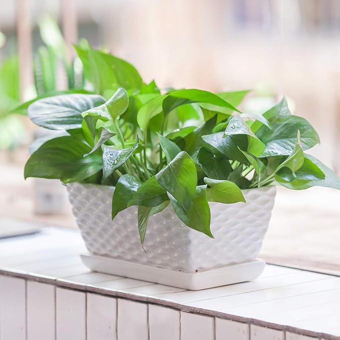Brajttt Flower Pots,Rectangular Modern White Ceramic Succulent Pots with Drainage, Garden Pots with Hole, Ceramic Pots, Planter Box with Saucer 2 Set