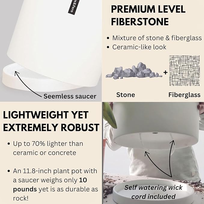 - LIGHTWEIGHT AND DURABLE FIBERSTONE – Up to 70% lighter than ceramic or concrete, this fiberstone 12 inch plant pot with a saucer weighs only 10 pounds! Our planters are also frost and UV resistant, making them ideal for both outdoor and indoor use.