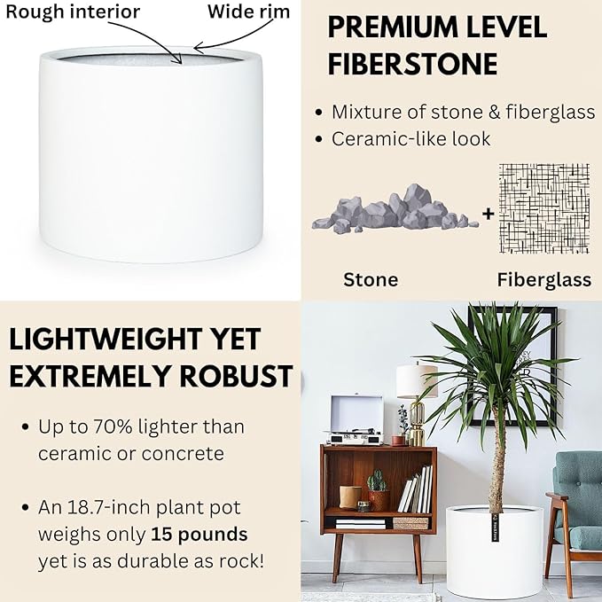- LIGHTWEIGHT AND DURABLE FIBERSTONE – Up to 70% lighter than ceramic or concrete, this fiberstone 18.7 inch plant pot weighs only 15.6 pounds! Our planters are also frost and UV resistant, making them ideal for both outdoor and indoor use.