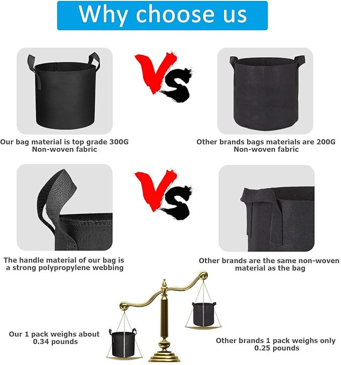 - 【Premium Material】Our grow bags are all made of high quality 300g thicken nonwoven fabric.