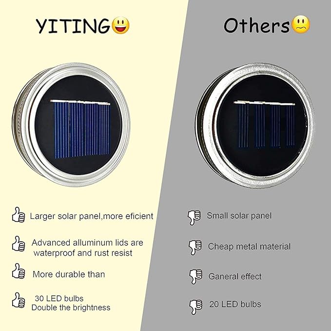 - ENERGY SAVING. Equipped with an upgraded monocrystalline silicon solar panel, our mason jar solar light has a larger size and higher conversion rate, enabling absorb more solar energy. After 6-8 hours fully charged during the day, the solar lights can work for 8-10 hours