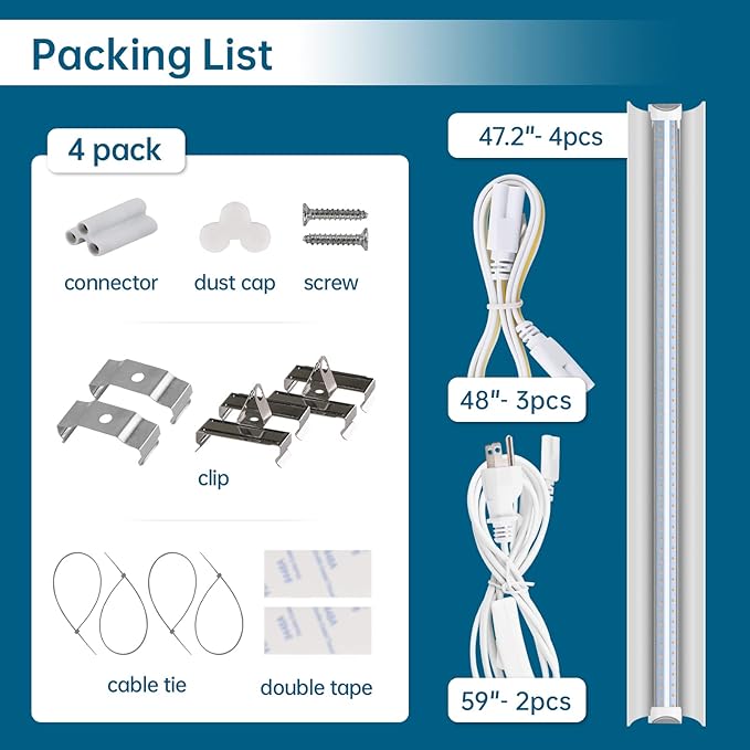 - What You Get - 4 x Barrina LED Grow lights, 2 x Power cords with ON/OFF switch, 4 x Connecting Cords(48''), 4 x Small Connectors, 16x Installation Clips, 8 x Double-sided tape, 16 x cable ties.