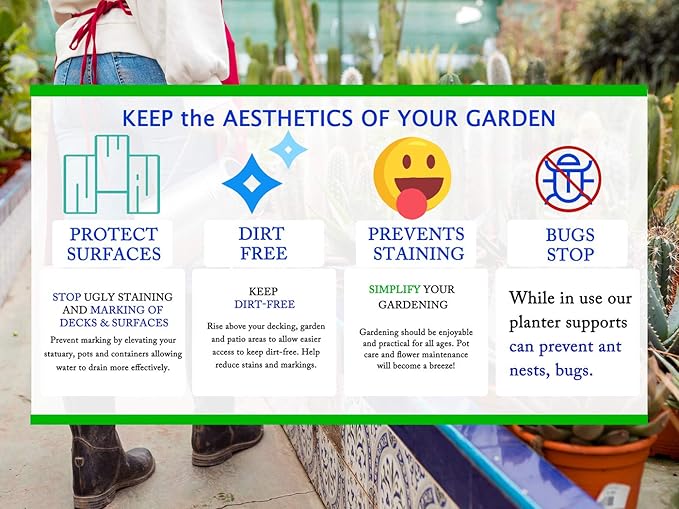 - HAPPIER GARDENING - Prop up plants, flower pots and garden items above lawns, patios, and decking to rise above the challenges of stains, soil build-up infestation!