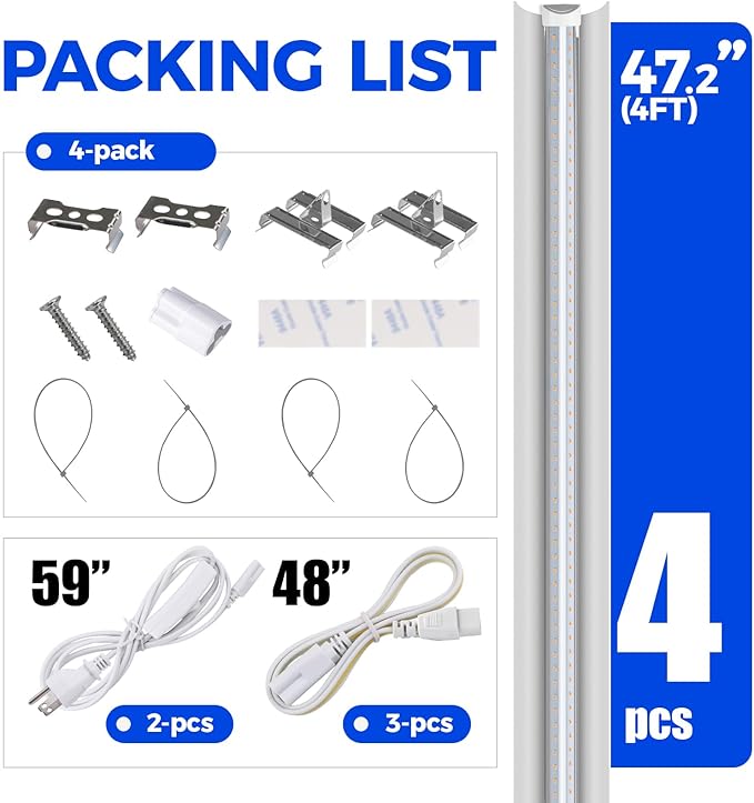 - What You Get: 4 x Barrina LED Grow lights, 2 x Power cords with ON/OFF switch, 4 x Connecting Cords(48''), 4 x Small Connectors, 16x Installation Clips, 8 x Double-sided tape, 16 x cable ties