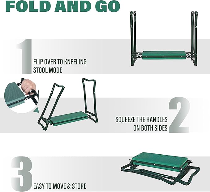 - Compact Folding - With just a snap, you can unfold and fold back this great kneeling stool. The bench is sturdy, but light enough to pick up easily and move around the garden.