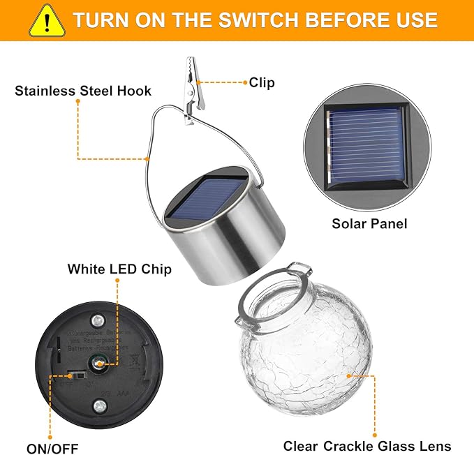 - Easy & Quick Installation:Solar powered, no electrical wiring or outlets needed. Just slide the switch to the "on" position before hanging the solar crackle glass ball lights with Sheppard's hooks on somewhere that can absorb full and direct sunlight.