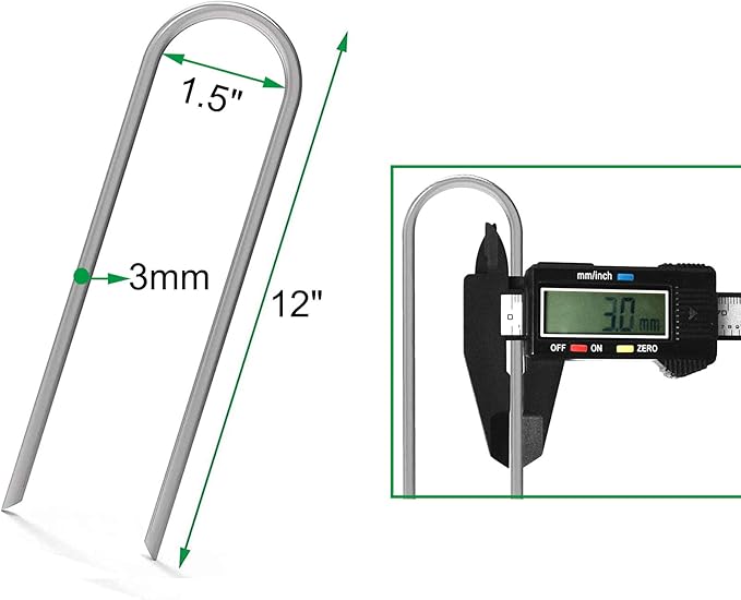 - 12 INCH 11 GAUGE STAKES - 12" length, 1.5" width, 11Ga (3.0mm) diameter, 100 pack extra heavy duty galvanized 12 inch metal garden stakes sinks deep into the ground, great for outdoor use, can secure tents, dig dog fence, chicken wire mesh, invisible fencing,Christmas decorations.
