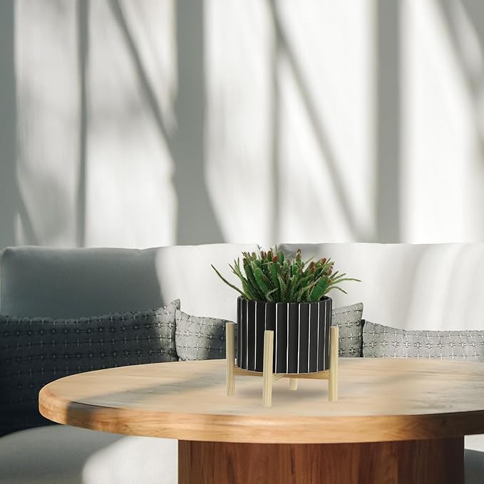 Sagebrook Home 8" Ceramic Planter - Black Planter Elevated on Wooden Stand with Fluted Design - for Indoor or Outdoor Plants, Great Gift Idea for Plant Lovers
