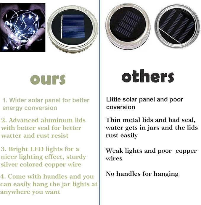 - High Quality & Romantic - Very popular Mason Jar string fairy firefly lights lids. Turn your discarded mason jars into beautiful lights to decorate your surroundings.Just put it on shelves,tables,porches, trees,patios and pergolas.A great gift family and friends who love decorating home