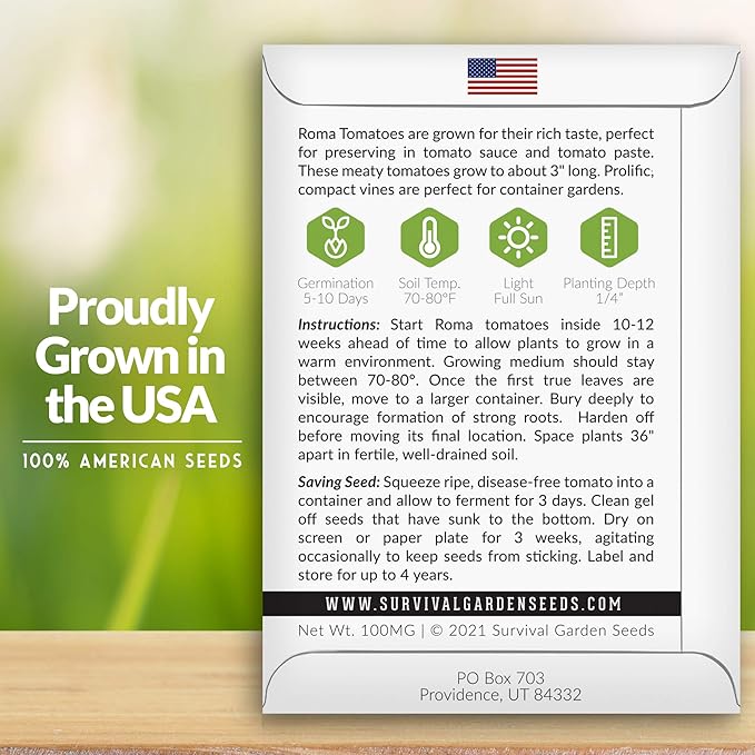 - Small American Family-Owned Business - We’re committed to always providing fresh, high-quality roma tomato seeds for planting now or to store for future growing seasons. We pledge to sell only safe, non-hybrid non-GMO heirloom seeds that are always open-pollinated, untreated, and tested to ensure the best germination rates. They will remain viable for years if stored properly in a cool dry.