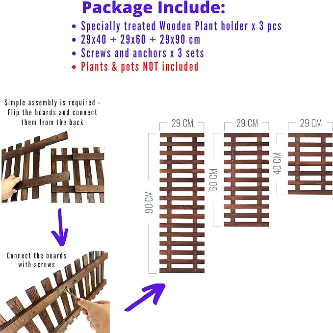 - 3 Pack: 29x40cmx1pc + 29x60cmx1pc + 29x90cmx1pc. Plants, flowers, pots, decorations are NOT included