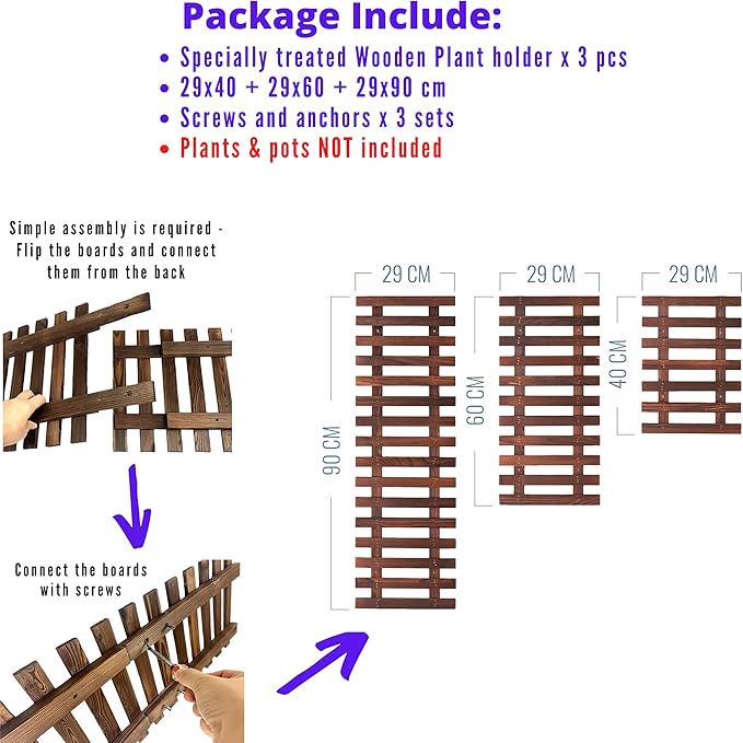 - 3 Pack: 29x40cmx1pc + 29x60cmx1pc + 29x90cmx1pc. Plants, flowers, pots, decorations are NOT included