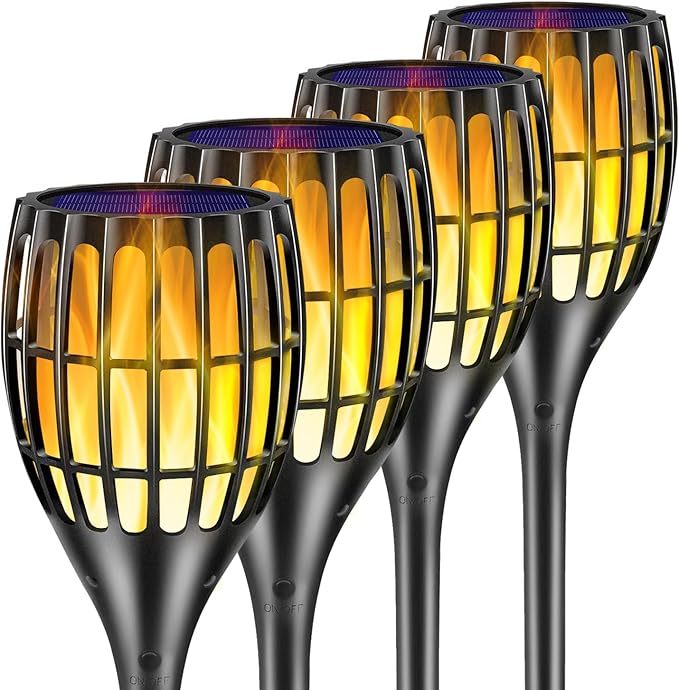 - š„ EASY INSTALLATION & IP65 WEATHERPROOF - Just place the solar flame lights into your lawn, garden, a flower pot, bench, pathways. IP65 waterproof dancing flame solar torch light was built to withstand all kinds of weather all round year.