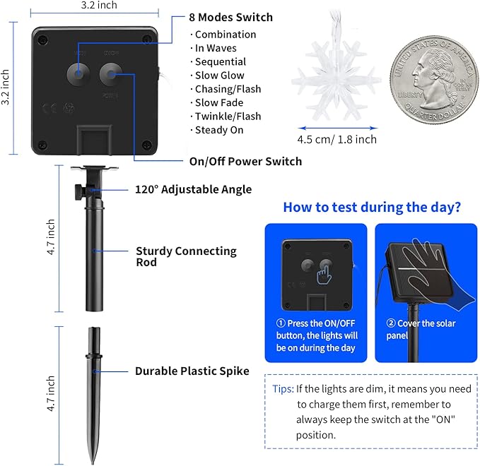 - 【Auto On/Off Management】There is a built in photosensitive component in the solar panel, the Christmas Snowflake lights will turn on at dusk and turn off at dawn automatically; No need for manual operation, so convenient for lighting decor; If you have any questions with our products, Please feel free to contact us.