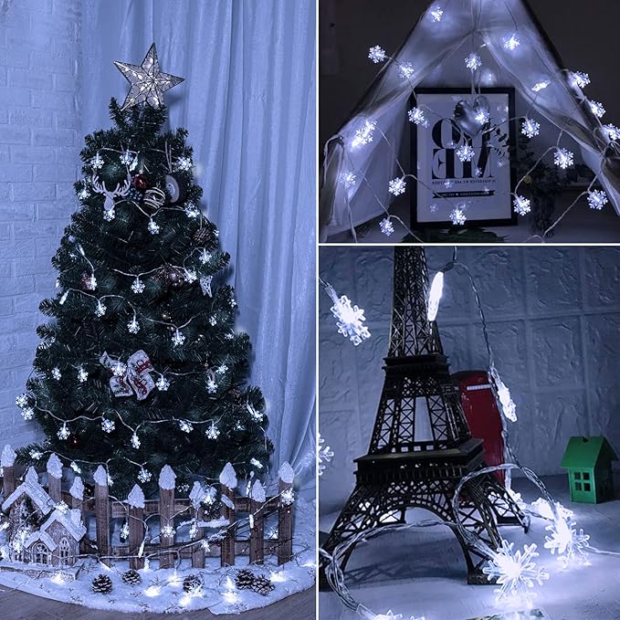 - 【Romantic Snowflake Christmas Lights】39 ft long string with 100 LED pure white snowflake lights, when they are working at night, they are like snowflakes falling from the sky, which will add romantic colors to your life and create a harmonious atmosphere; Suitable for bedroom, courtyard, terrace, balcony, BBQ, tent decoration and more.