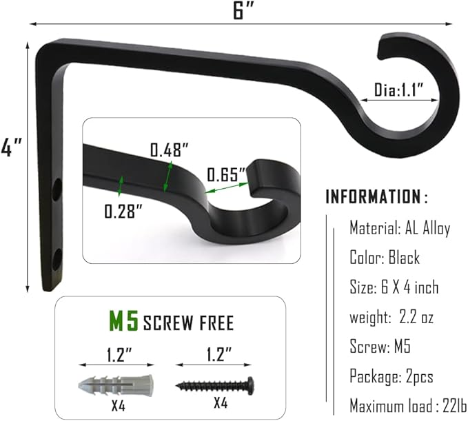 - 【EASY TO INSTALL】This package includes 2 plant hooks, 4 screws and 4 wall anchors, and maximum load up to 22 lb. Each screw is a standard M5 screw, 1.2 inches long. All you have to do is screw the screws into the wooden fence posts, deck posts and even the interior walls. It looks great in a variety of different environments.