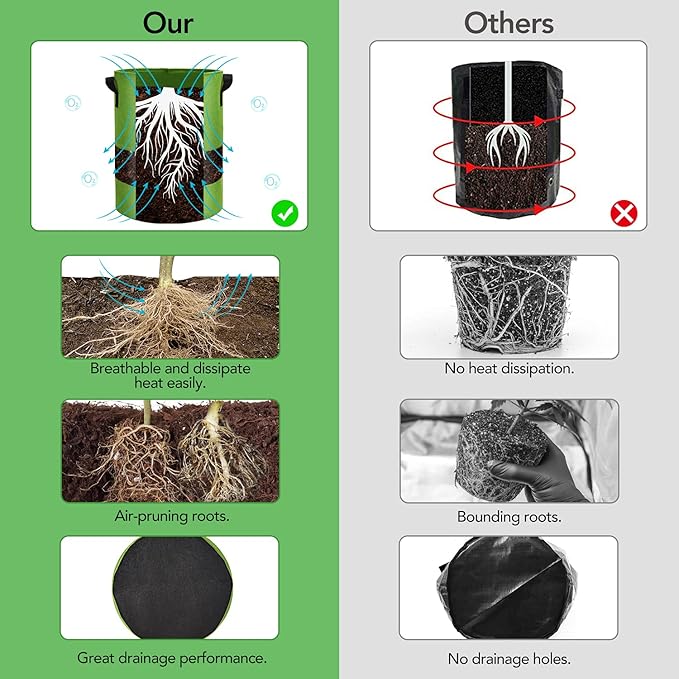 - 【 Upgrade 360 Degree Visible Space& Harvest Window</strong>】Our 10 gallon fabric sweet potato grow bags with 2 flaps have a convenient design for using transparent material. it’s easy to check the growing process of plant roots without digging clay. When the root fruit harvest, a large enough flap window in the root area will help you get the root fruit without damaging the plant.What' more, we add a blackout fabric to better protect your plant roots .</p>