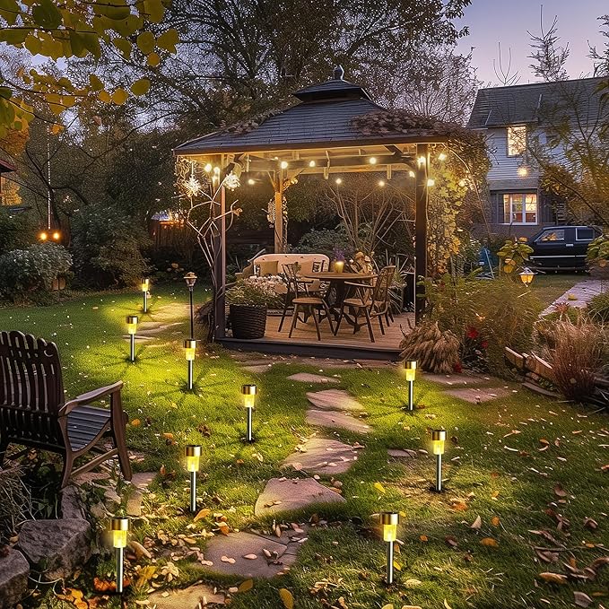 - [SOLAR LIGHTS & ECO-FRIENDLY]:100% solar powered. 12 outdoor solar lights with high-efficiency solar panels can absorb solar energy during the day, turn on automatically at night, and turn off at dawn, which can provide you with free lighting all night