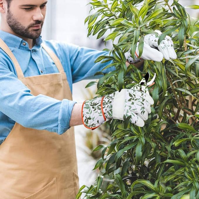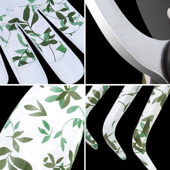 - NICE FLORAL DESIGN: Beautiful Spring leaves printed gardening gloves with goatskin leather and garden tools set