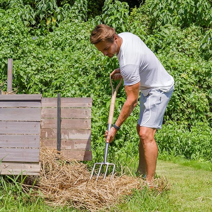 - WIDE APPLICATION - Upgrade your garden tools with digging fork! The digging fork has four steel tines, which can easily screen soil, mulch, gravel, grass, etc. The stainless steel head is durable and can be used for a long time. This kind of pitchfork is very suitable for moving leaves, straw, hay in the garden where fertilizer is needed or turning the soil in bed, compost or waste.