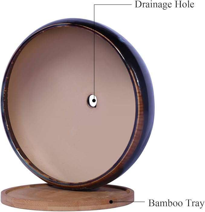 SQOWL 7 Inch Round Ceramic Succulent Planter Pot Drip Glazed Shallow Planter with Drainage Bamboo Tray for Indoor Plants