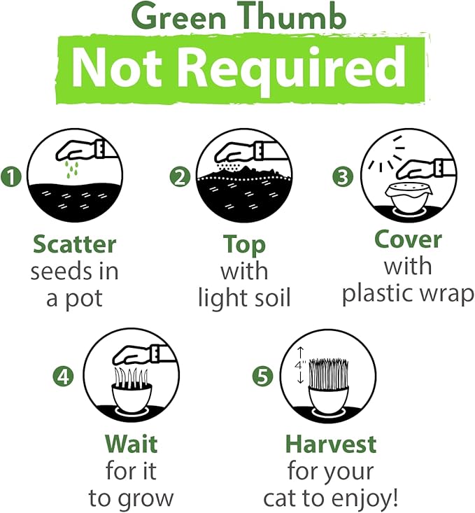- Grows Indoors Quickly & Easily: Designed for hassle-free indoor cultivation, these seeds germinate quickly—typically within 5 to 7 days—so your cat can enjoy fresh greens in no time. All you need is a small container, soil or potting mix, water, and a bright windowsill. Perfect for any living space, from apartments to homes, it’s a low-maintenance way to enrich your pet’s daily routine.