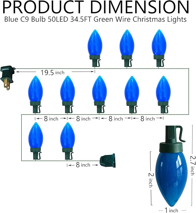 - [Product Dimension] Total length 34.5 Feet including lead cord 19.5 inches, tail cord 8 inches, 8 inches distance between each LED light. The diameter of c9 bulb is 1 inch, the height is 2 inches. Blue c9 lights, all LED light and c9 bulbs are blue.