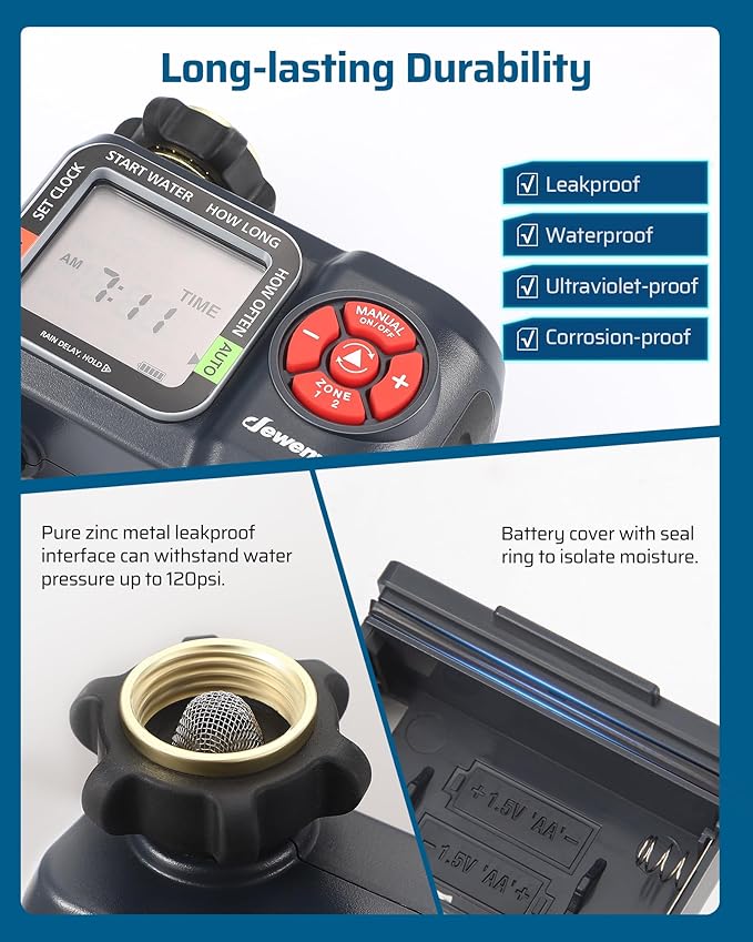 DEWENWILS Sprinkler Timer 2 Zone, Water Hose Timer with Rain Delay/Manual Watering/Automatic Irrigation Timer, Programmable Outdoor Faucet Timer for Garden, Yard, Lawn