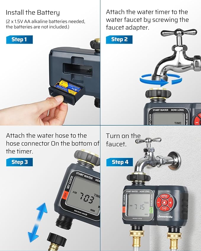 - [Easy to Program] This water timer for garden hose is easy to set, allowing for customized watering schedules (1-360mins) on any day or days of the week, or on a biweekly basis; cooperate with multiple water hose pipes to meet the weekly watering and irrigation requirements of an entire household