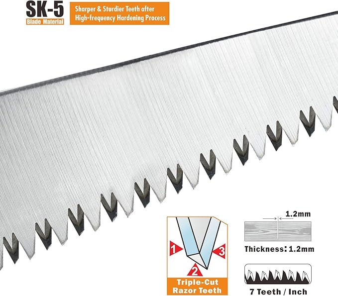 - Bright and long service life Sharp durable saw blade:Blade choose5.1" SK-5 steel blade, made in Korea and 1.2mm thick, after high frequency hardening,the hardness of the blade body reaches 51-52 hrc and the tooth tip reaches 64-67 hrc,designed to two staggered rows of triple-cut razor teeth ( 7 TPI ),and use grinding process and chrome-plated surface treatment.